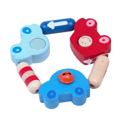 商品简介:小鼠头形状积木块串成的小手链,仔细一看会发现小鼠头里藏着小铃铛和小镜子喔.培养宝宝的注意力和抓握能力.